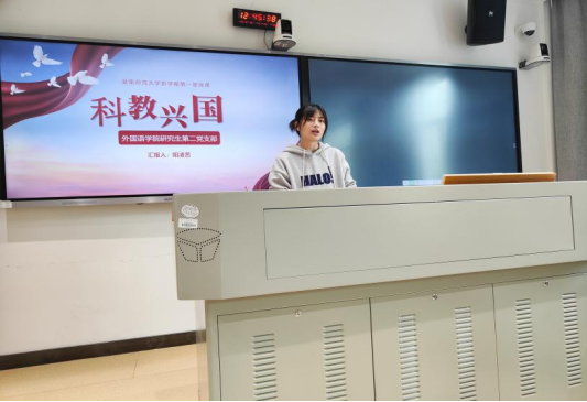 本次党课由支部书记阳凌艺讲解,党课内容紧紧围绕科技、教育、人才三个方面,主要从四个部分展开:科教兴国战略的时代背景、科教兴国战略思想的内涵、党的二十大对教育工作的部署以及当代大学生的责任与使命。其次,支部书记还将党课内容与党员同志们的实际生活联系起来,结合党课内容中的“985工程”“211工程”对同志们进行提问,从而提高同志们的参与度。最后,书记向同志们提出了寄语:“为天地立心,为生民立命,为往圣继绝学,为万世开太平。”