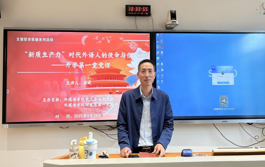 (通讯员 李湘)2025年9月25日下午,澳门pg官方电子平台教工第四党支部与研究生第一党支部在腾龙楼404教室联合举办“开学第一堂党课”学习活动。本次活动以“新质生产力时代外语人的使命与作为”为主题,深入开展理论学习与交流研讨。活动由澳门pg官方电子平台副院长梁斌主持并主讲,两支部全体党员参加。