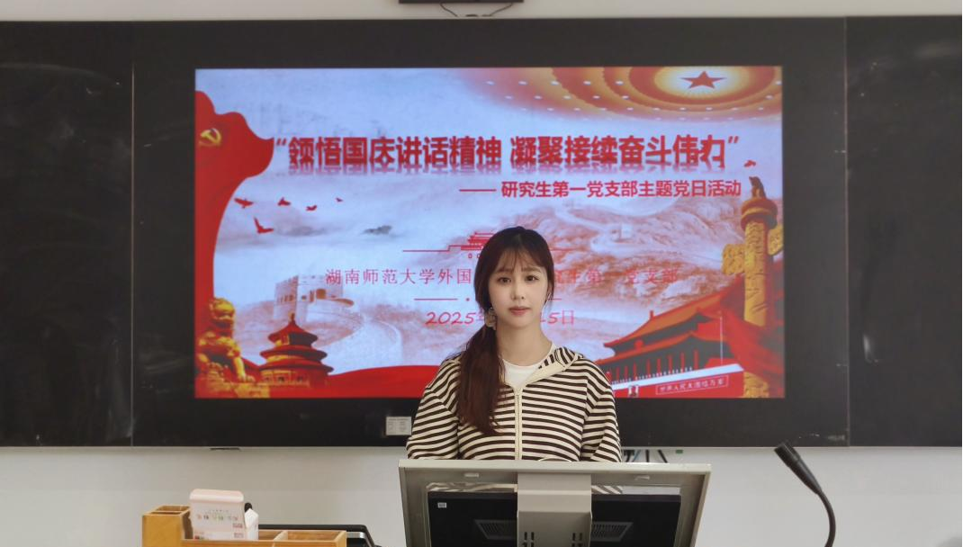 (通讯员 李湘)2025年10月15日,澳门pg官方电子平台研究生第一党支部在腾龙楼604教室成功举办“领悟国庆讲话精神、凝聚接续奋斗伟力”主题党日活动。本次活动由支部副书记蔡佳珺主持,支部全体党员及入党积极分子参加。