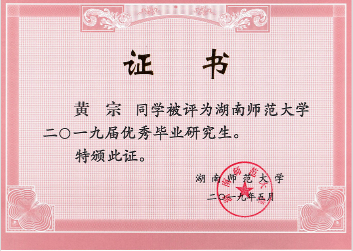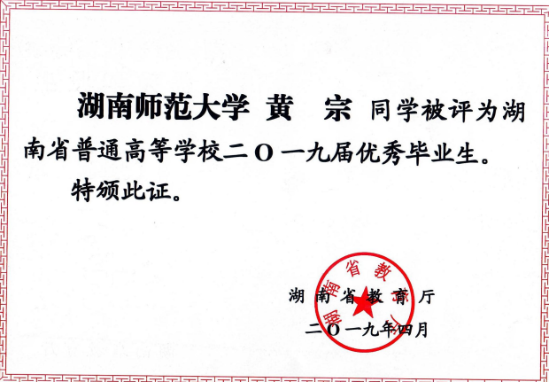 (黄宗同志获得湖南省普通高等学校2019届优秀毕业生)