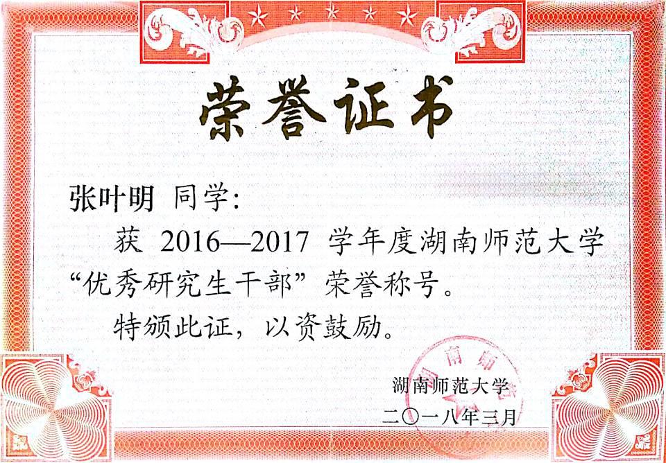 (张叶明同志获得“优秀研究生干部”荣誉称号)