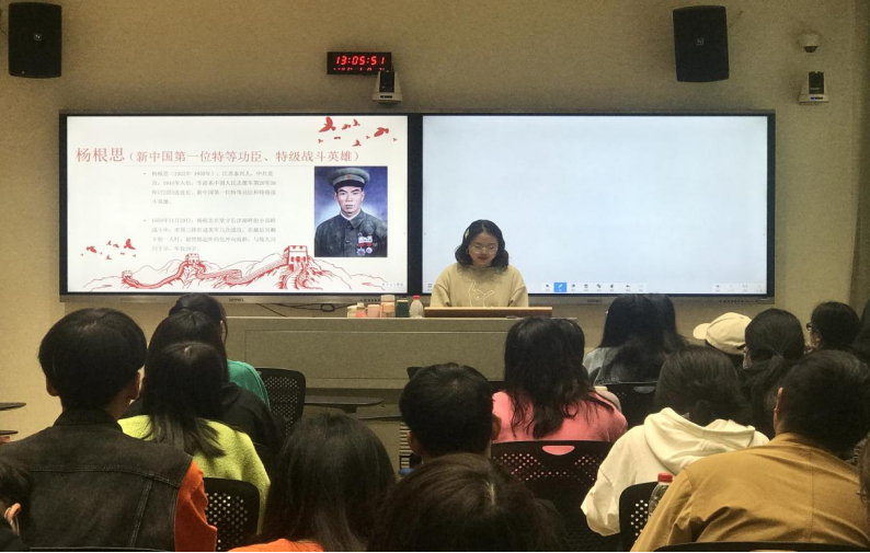 甘奉玉同志介绍了杨根思同志的油画与他在长津湖战役中的英勇事迹,并向大家介绍了杨根思同志的“三个不相信”英雄宣言——“不相信有完不成的任务、不相信有克服不了的困难、不相信有战胜不了的敌人”。