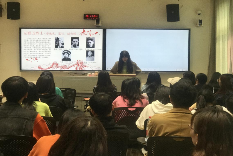 邹鑫雨同志通过文物图片“一件布满弹孔的毛背心”介绍了左联五烈士——李求实、柔石、胡也频、冯铿、殷夫的革命英雄事迹。