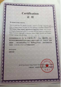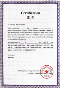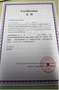 2023年4月,朱素珍同学参与了“全国大学生英语翻译大赛”的志愿服务工作,并荣获“优秀志愿者”称号。