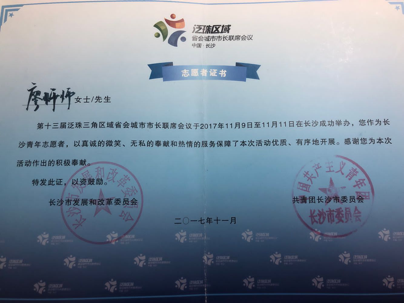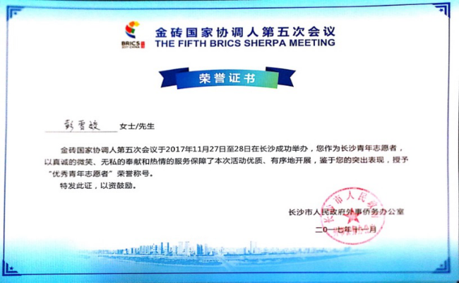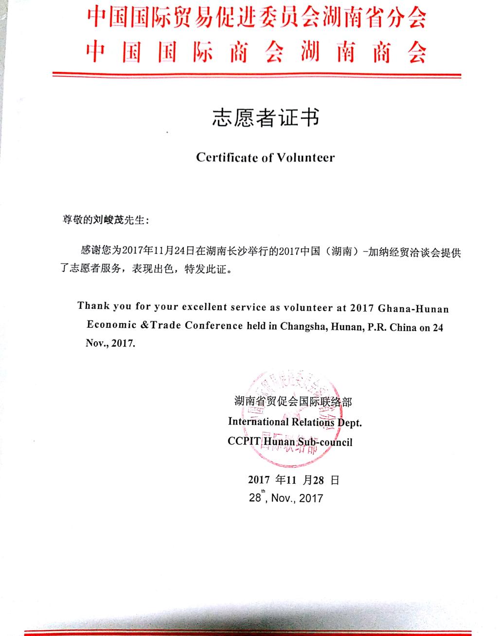 2017年11月24日,刘峻茂担任“2017中国(湖南)-加纳经贸洽谈会”志愿者,部分志愿者证书照片如下: