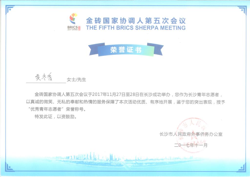 2017年11月27日至28日,黄冬香、彭雪娇、徐文吉、翁录梅、左沁宇等同学在金砖国家协调人第五次会议中担任志愿者,其中黄冬香、彭雪娇、徐文吉同学获得“优秀青年志愿者”称号。