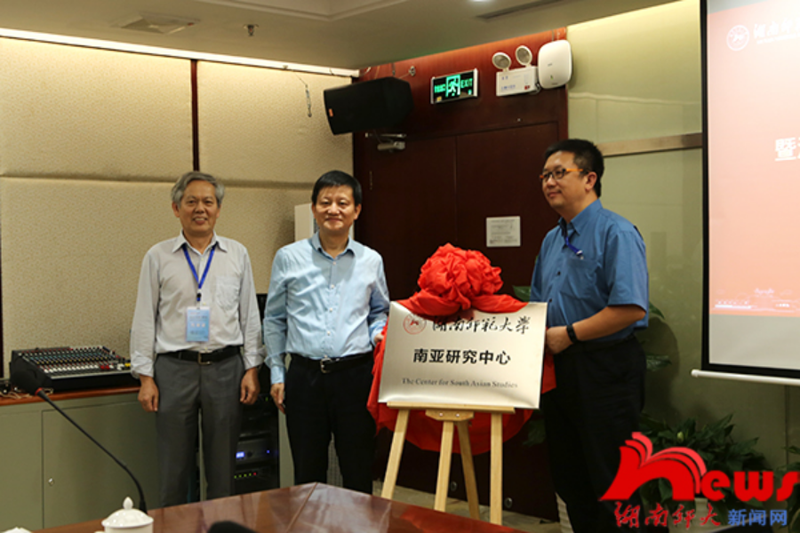 蒋洪新、叶海林及南亚研究中心主任刘曙雄共同为“南亚研究中心”揭牌。