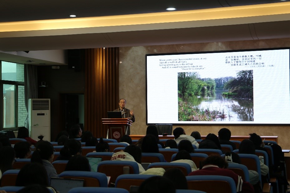 在讲座中,傅浩教授将爱尔兰诗歌巨擘叶芝的个人经历、家国情怀与“翡翠岛”的绣绮青山、涟漪绿水交织融汇,结合他前往“叶芝郡”等地朝圣之旅期间的实景拍摄,对叶芝不同创作时期的代表性诗作进行了深刻阐释。整场讲座既旁征博引、信手拈来,又抽丝剥茧、深入浅出,兼具学理深度与学术厚度。