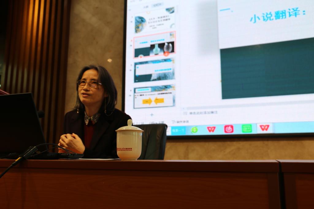 讲座伊始,柯彦玢教授首先客观地指出当今文学翻译界的现存问题,诸如对文本翻译的质量评判、文学翻译应当呈现何种状态这类问题讳莫如深等,于在场师生之间引起共鸣、激发深思。接着,柯教授从“文学语言的特征”切入展开,指出在文学作品中“形式即内容,内容即形式,”并且作品的语言、表现形式与内容应当浑然一体、不可割裂而谈。这就要求小说翻译不仅要传达故事情节和内容,而且还要保留叙述模式、文体风格等艺术形式。在小说翻译前期的文本细读环节中,译者不能只进行浅层阅读,仅停留在文字以及内容层面,在此基础上更要注重小说叙述模式、文学批评、写作背景以及作者个人经历等相关资料的查阅和研究。