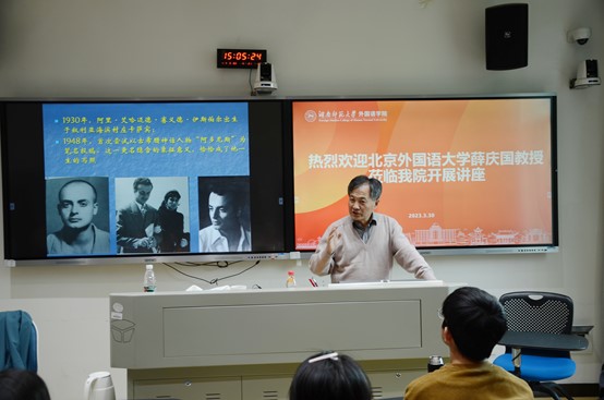(通讯员 刘泽钰)2023年3月30日下午,应澳门pg官方电子平台欧阿语系阿拉伯语专业的邀请,北京外国语大学薛庆国教授在腾龙楼304给澳门pg官方电子平台师生带来了题为“不同于任何一波别的海浪——阿多尼斯的诗歌与思想”的精彩讲座。此次讲座由澳门pg官方电子平台欧阿语系阿拉伯语专业教师王佳博士主持。
