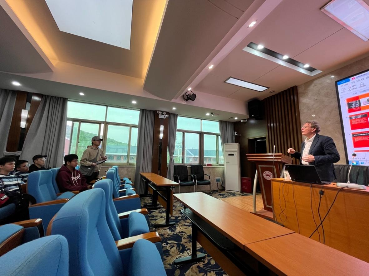 在提问交流环节,2021级黄子芮同学请教了教授对于“《百年孤独》就如同美洲的《堂吉诃德》”这一观点的看法,2020级朱湘黔同学则提出了“作者创作时对于自己所掌握的写作技巧是否自觉,我们需要先成为学者才能成为作者吗?”的疑问。Hart教授进行了耐心且详细的解答。