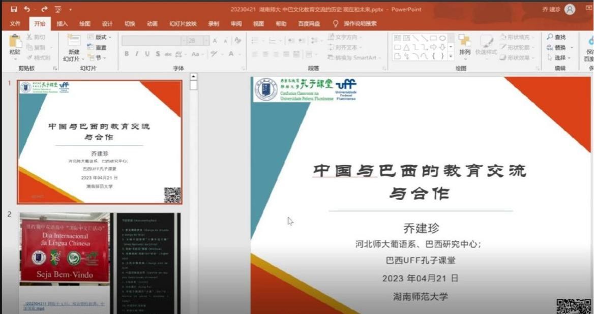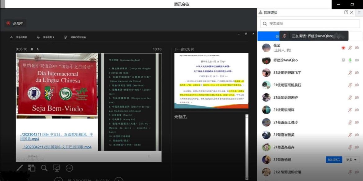 (通讯员 高卉)4月21日晚,河北师范大学西葡语系系主任、河北师范大学巴西弗鲁米嫩塞联邦大学孔子课堂负责人、巴西里约热内卢天主教大学孔子学院首任中方院长乔建珍以“中国与巴西的教育交流与合作”为主题,为2021级葡萄牙语专业师生于腾讯会议开展讲座,讲座由葡萄牙语专业教师张莹主持。
