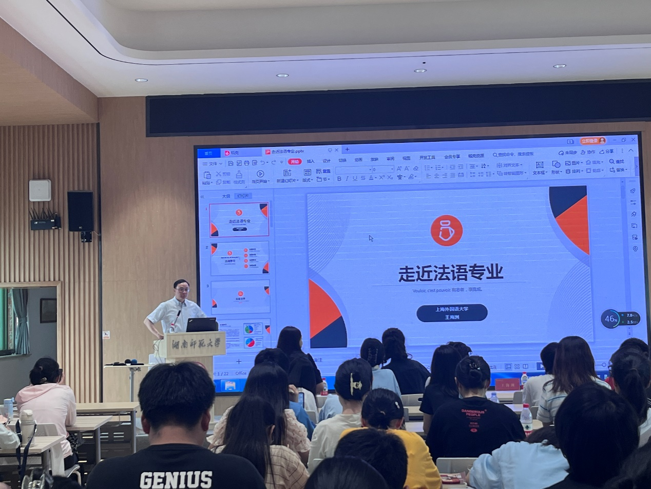 (通讯员 钱丹)2023年5月5日中午,澳门pg官网邀请上海外国语大学法语系王海洲教授于腾龙楼613报告厅开展外语专业领航计划系列讲座之“走进法语专业”。澳门pg官网法语系主任方丽平副教授主持本场讲座。2022级200余名学生参加了此次讲座。