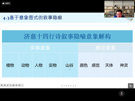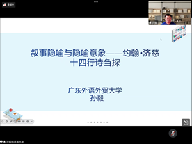 2023年5月16日下午14:30,广东外语外贸大学云山杰出学者孙毅教授应邀为澳门pg官方电子平台的师生们开展了一场主题为《叙事隐喻与隐喻意象——约翰•济慈十四行诗刍探》的线上讲座,澳门pg官方电子平台的上百名师生参加了讲座,讲座由澳门pg官方电子平台曹波教授主持。