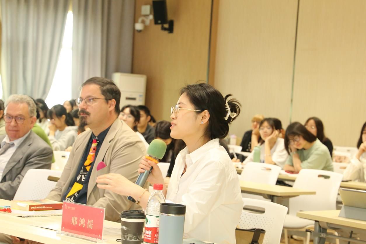 讲座结束后,斯蒂芬·哈特教授对玛吉·鲍尔斯教授关于魔幻现实主义戏剧改编的解析进行了总结和点评。讲座最后,邢鸿儒博士向玛吉·鲍尔斯教授表达了诚挚谢意,并与她共同探讨了对拉美地区对魔幻现实主义作品进行戏剧改编的相关研究。