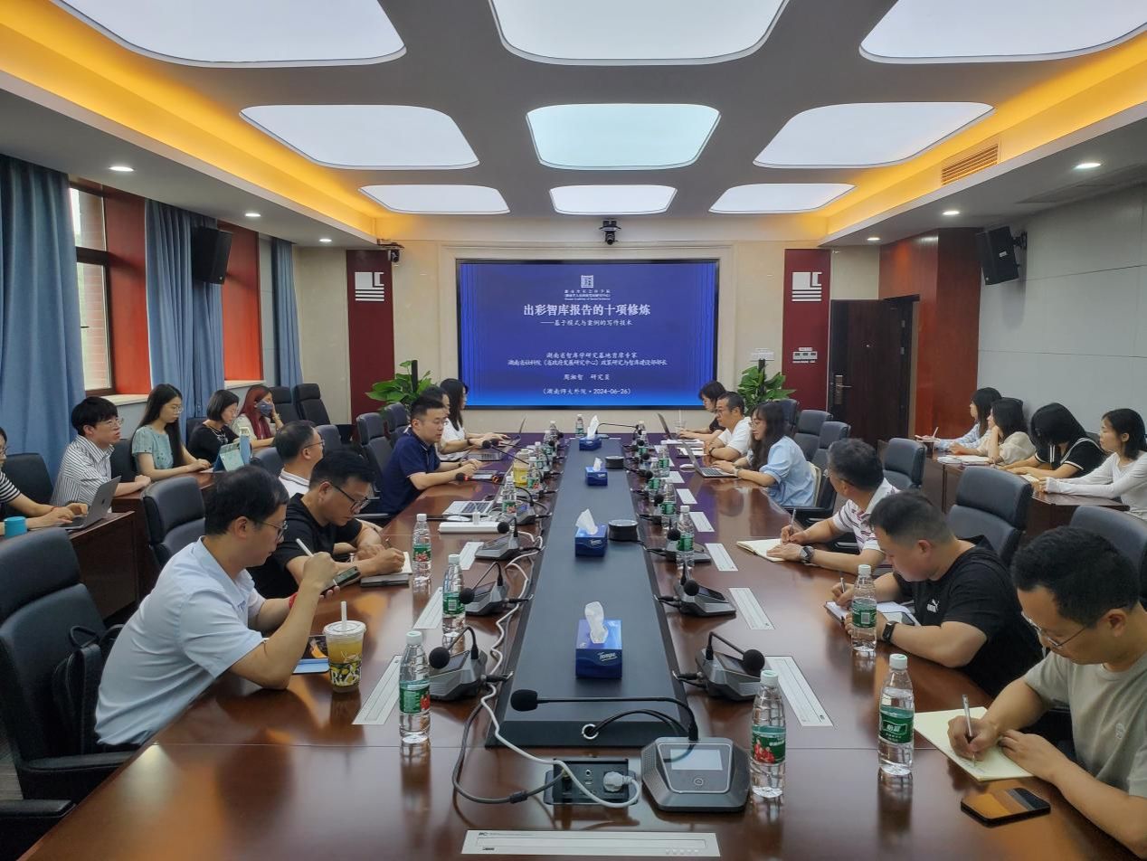 6月26日,湖南省社会科学院(省人民政府发展研究中心)政策研究与智库建设部部长周湘智在中和楼611会议室做“出彩智库报告的十项修炼——基于模式与案例的写作技术”讲座。澳门pg官方电子平台院长曾艳钰、副院长蒋莉华、人工智能与精准国际传播湖南省哲学社会科学重点实验室主任高协平、湖南省首批专业特色智库“一带一路”文化交流与传播研究中心执行主任陈小法出席活动。讲座由语言与文化研究院副院长杨安主持。