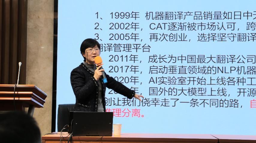 活动伊始,闫栗丽女士以查尔斯·达尔文的名言“能够生存下来的物种不是最强的,也不是最聪明的,而是最能适应变化的”巧妙开场,强调了适应能力在语言服务行业发展中的关键意义。她指出,语言服务行业作为信息交流与文化传播的关键,正被AI重塑。传统语言服务模式已难以为继,敲响了语言教育行业改革创新的警钟。