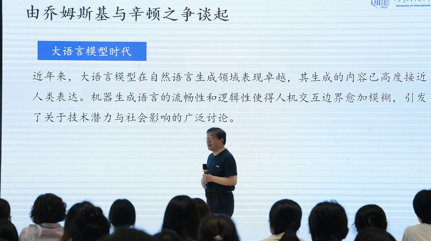 讲座伊始,向明友教授从乔姆斯基与辛顿之间的学术争论谈起,指出大语言模型时代的到来是人类不断探寻真理的必然结果,同时也强调了语言智能研发在当今时代的重要性。他提到,语言使用是人类的智能活动,语言智能作为语言学、人工智能、认知科学、脑科学等多学科交叉融合的前沿研究领域,对人工智能的发展至关重要。然而,尽管像ChatGPT这样的大语言模型能够生成近似人类的语言表达,但其内在运行机制仍然是一个“黑箱”。基于经验主义的大语言模型无法真正理解语言意义,从而引发了生成结果的不可解释性和不可预测性。