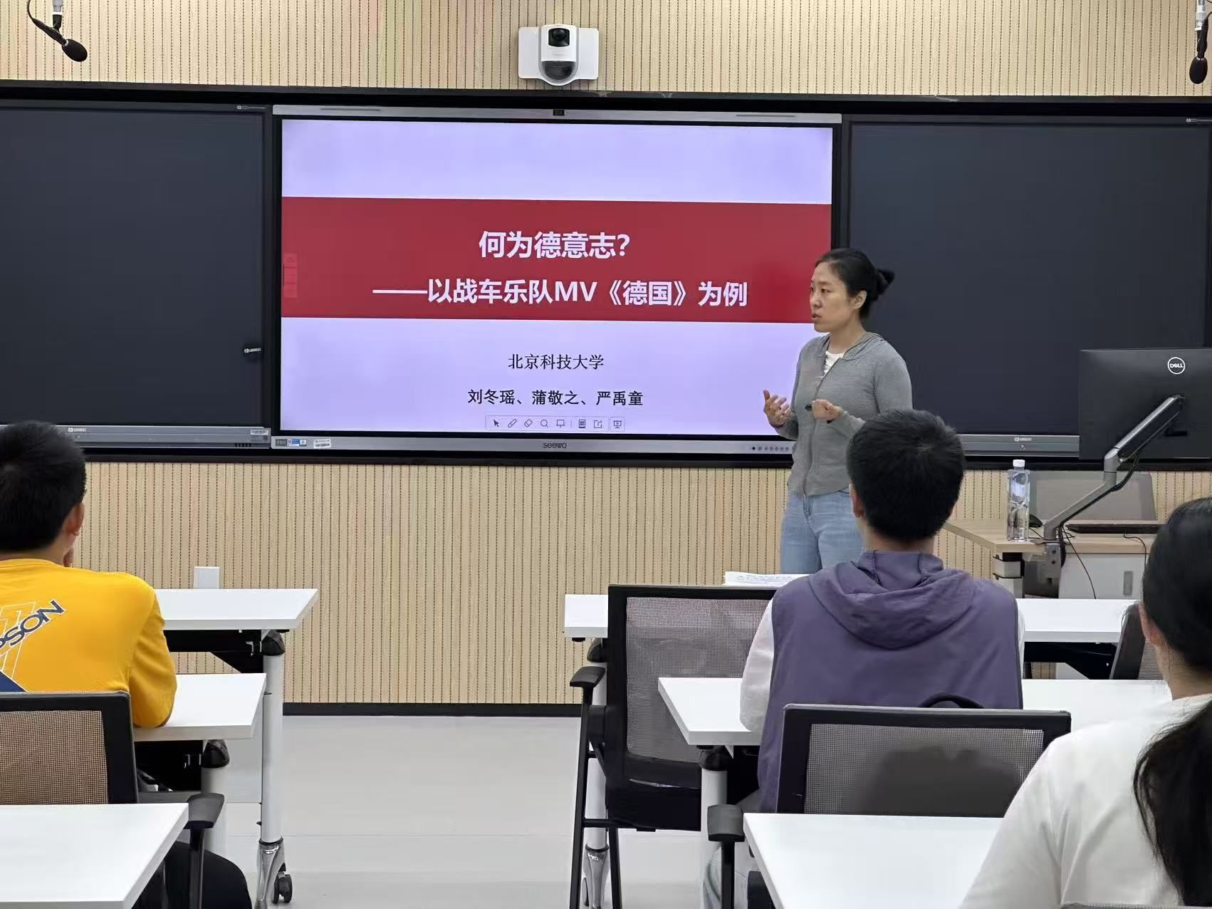 讲座伊始,刘冬瑶副教授以战车乐队单曲预告片在德国内外引发的争议为切入点,抛出“同一作品为何塑造对立德意志形象,何为德意志”这一核心问题。在后续的讲解中,她运用互文性理论,从歌词文本、演唱配乐、视觉艺术三方面展开分析了德意志形象在艺术创作中的多元呈现。刘老师认为,应该摆脱“盖棺定论”,打破对德意志形象的单一认知,动态地理解国家形象的建构。