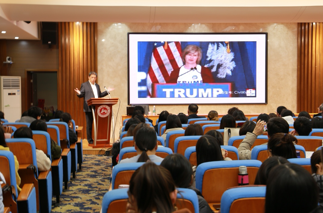 (通讯员唐丹)12月12日晚上,腾建群研究员应邀莅临我校,在澳门pg官方电子平台515学术报告厅作了一场以“中美关系现状与走向”为主题的学术讲座。澳门pg官方电子平台肖华峰教授主持了本次讲座,外院百余名研究生和老师到场聆听学习。