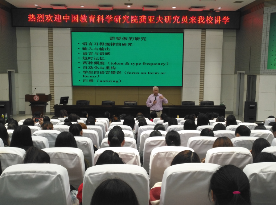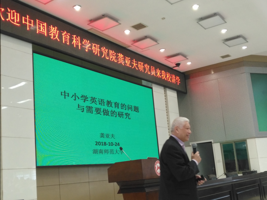 (通讯员李洪坤)10月24日上午,中国教育学会外语教学专业委员理事长龚亚夫研究员应邀到我校至善大讲堂作“中小学英语教育的问题与需要做的研究”的学术讲座。澳门pg官方电子平台副院长廖光蓉教授担任主持人,英语系学科英语教研室全体老师,长沙市岳麓区小学英语黄梦娟教研员率该区60多位小学英语老师出席了这次讲座。聆听这次讲座的还有澳门pg官方电子平台本科生、研究生等共计近300人。