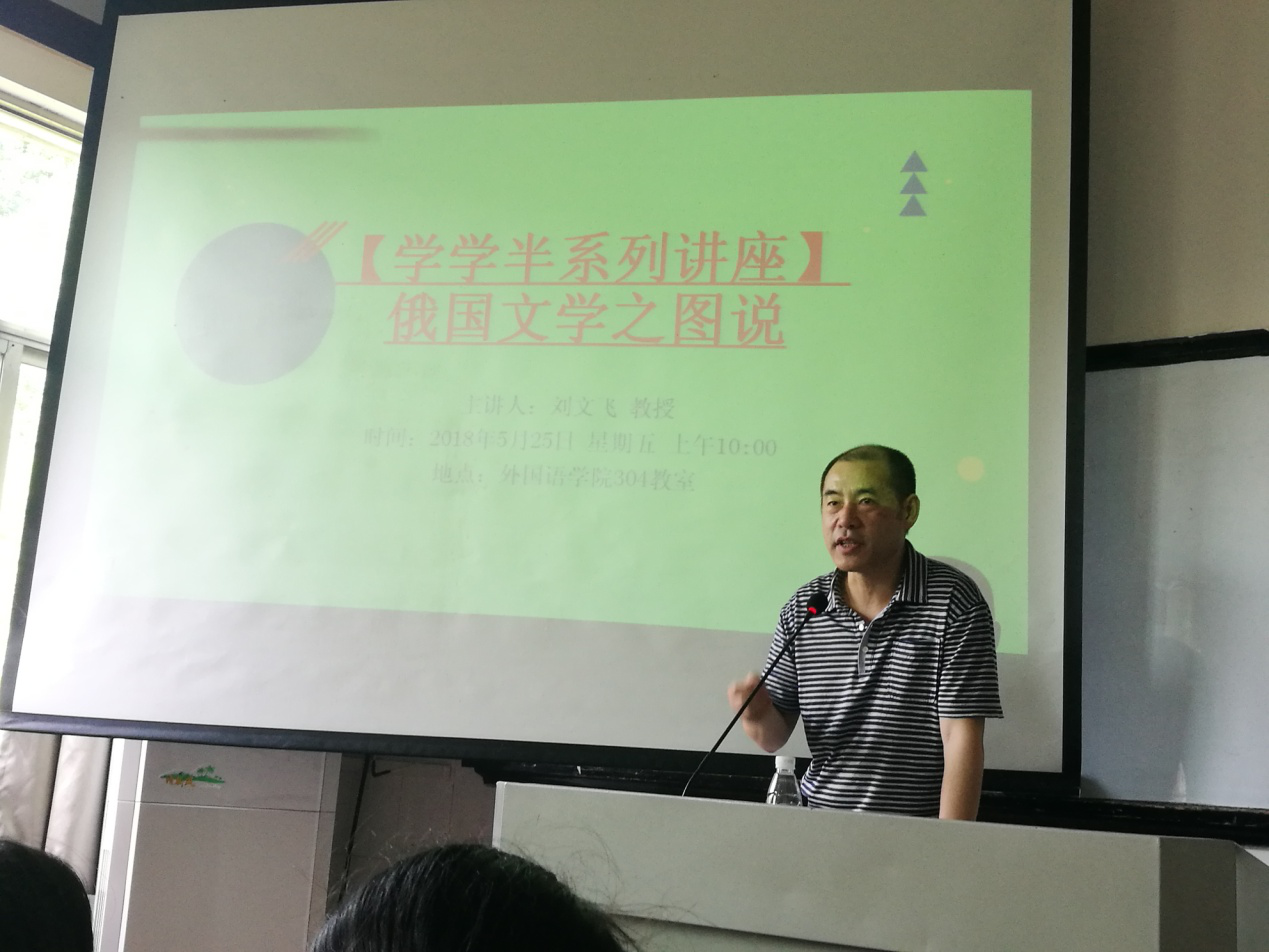 (通讯员万义程)2018年5月25日上午,首都师范大学澳门pg官方电子平台教授、中国社会科学院研究生院外国文学系教授、博士生导师、俄罗斯联邦“友谊奖章”获得者刘文飞莅临澳门pg官网讲学。他以“俄国文学之图说”为主题,为全体师生勾勒出俄国文学在漫漫历史长河中呈现出的优美画卷,讲座深入浅出、生动风趣,受到全体师生们的热烈欢迎。
