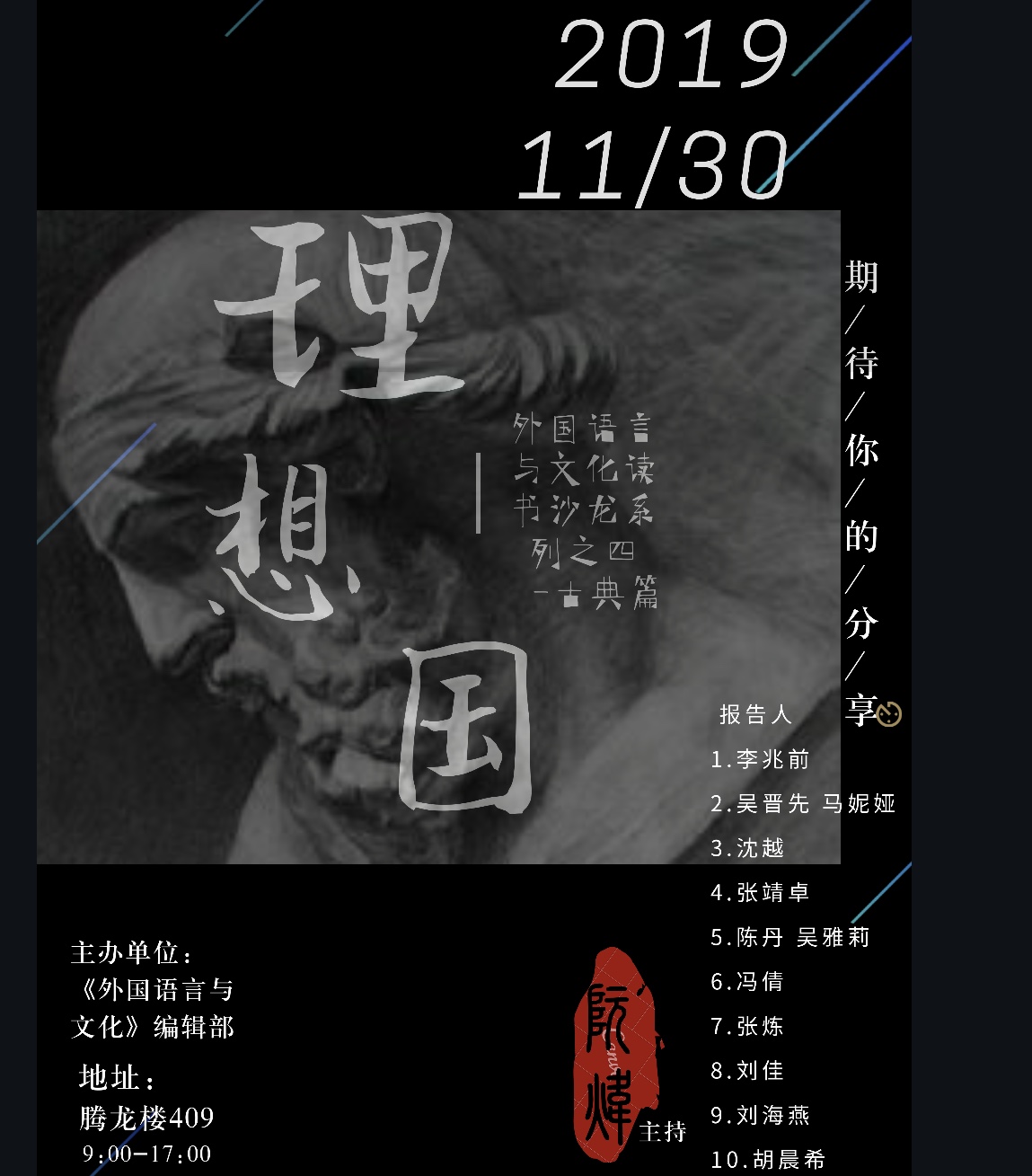 (通讯员:胡晨希)11月30日,由《外国语言与文化》编辑部主办的“柏拉图《理想国》”读书沙龙活动在澳门pg官方电子平台腾龙楼举行。本次活动由阮炜老师主持,《外国语言与文化》编辑部的编辑、澳门pg官方电子平台的师生,以及中南大学、湘潭大学、湖南第一师范学院、湖南农业大学、湖南财政经济学院等高校的师生一起围绕《理想国》展开了热烈讨论。