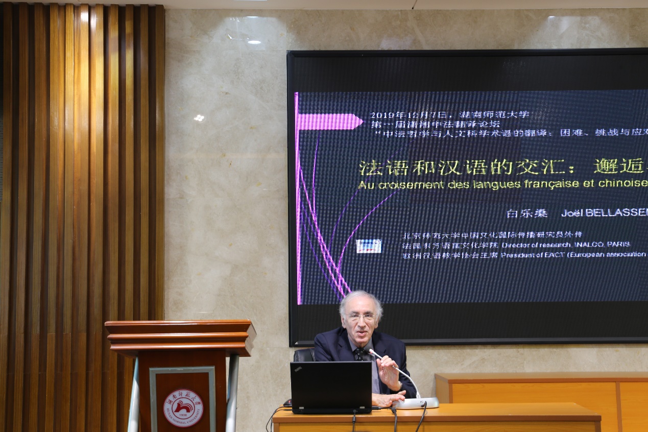白乐桑教授拥有极为丰富的教学经验,对于法国汉语教学及教学手段和对外汉语教学专业有非常深入的研究。他首先用一个问题引出了法国旅行家儒勒•迪蒙•杜维尔(1790-1842)提出的“语言距离”概念:语言面前,人人平等吗?他从四个方面对这个问题展开解答:客观语言距离、地理层面、语言间的亲缘关系、词汇语法及文字等的差异性。对于学习的类型学,其测度是针对一个特定使用者而言;对于语言类型学,则是针对一个特定语言而言。白乐桑教授详细解释了“客观语言距离”,其中包括词汇、语法、语言和距离。他还介绍了“心理语言距离”的含义,包括主观语言距离、语言习得者和目标语言的对比,以及心理层面和认知层面。他指出影响这些的因素是客观语言距离和民族文化差异。他随后进一步解释了“对法国学习者而言,其与中文的距离如何”这个问题,从音形差距、语言、声调等方面做了详细剖析。最后,白乐桑教授以幽默与翻译为例,说明在不同语言造成的不同思维中,对幽默的领悟会心程度会有很大的不同。白乐桑教授还借助其它一些例证,说明了法语和汉语之间的交会特点,以及两种语言对某些新词语的处理方式。