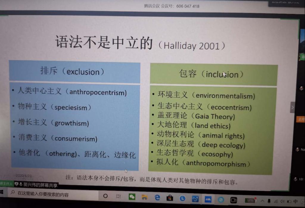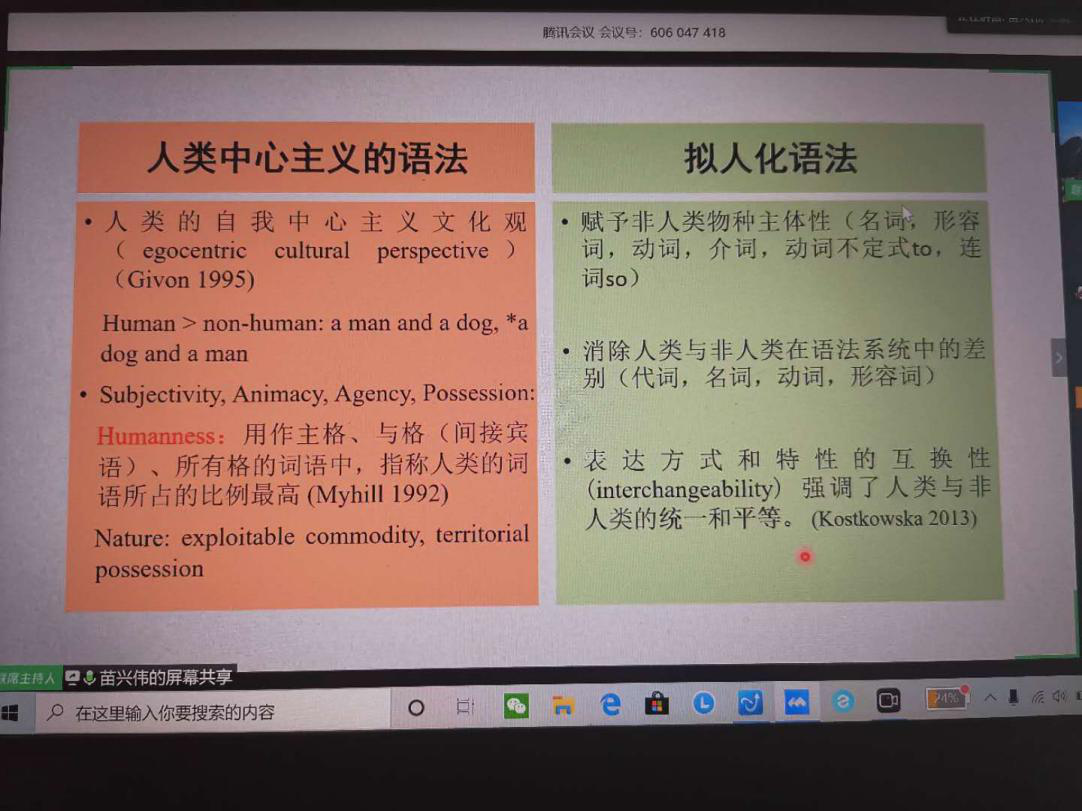 4月23日下午,北京师范大学外国语言文学学院院长、博士生导师苗兴伟教授应邀通过腾讯会议的方式为澳门pg官网师生做题为“拟人化语法的生态话语分析”的学术讲座,此次讲座由澳门pg官方电子平台廖光蓉教授主持,参会师生300余人。