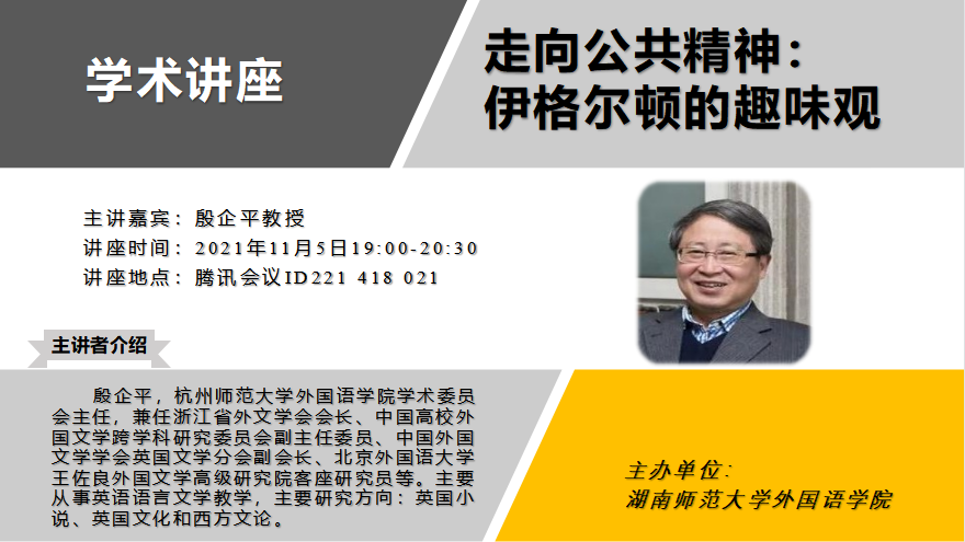 (通讯员:李姗)11月5日晚,受澳门pg官方电子平台之邀,杭州师范大学殷企平教授讲授了题为“走向公共精神:伊格尔顿的趣味观”的主题讲座,此次讲座由刘白教授主持开展。