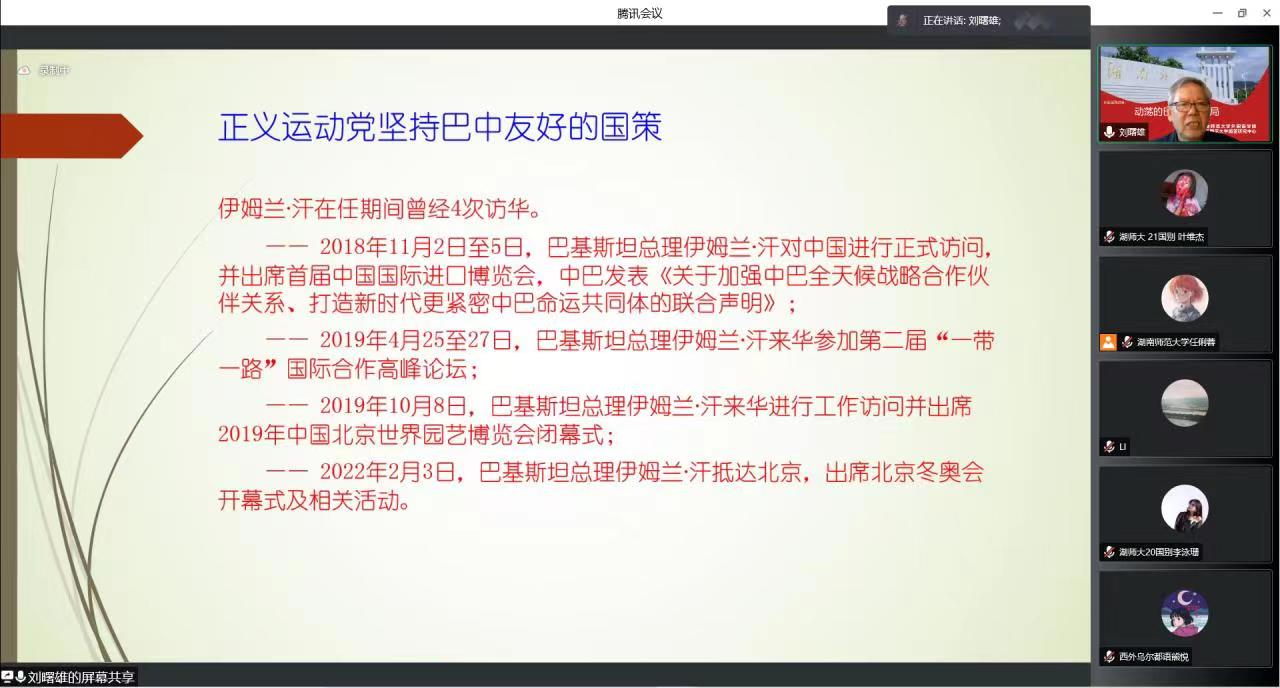 刘曙雄教授的讲座共分为五个部分:一、对伊姆兰·汗不信任动议;二、伊姆兰·汗其人;三、巴基斯坦争议运动党;四、巴基斯坦政局走向;五、维护中巴友好大局。