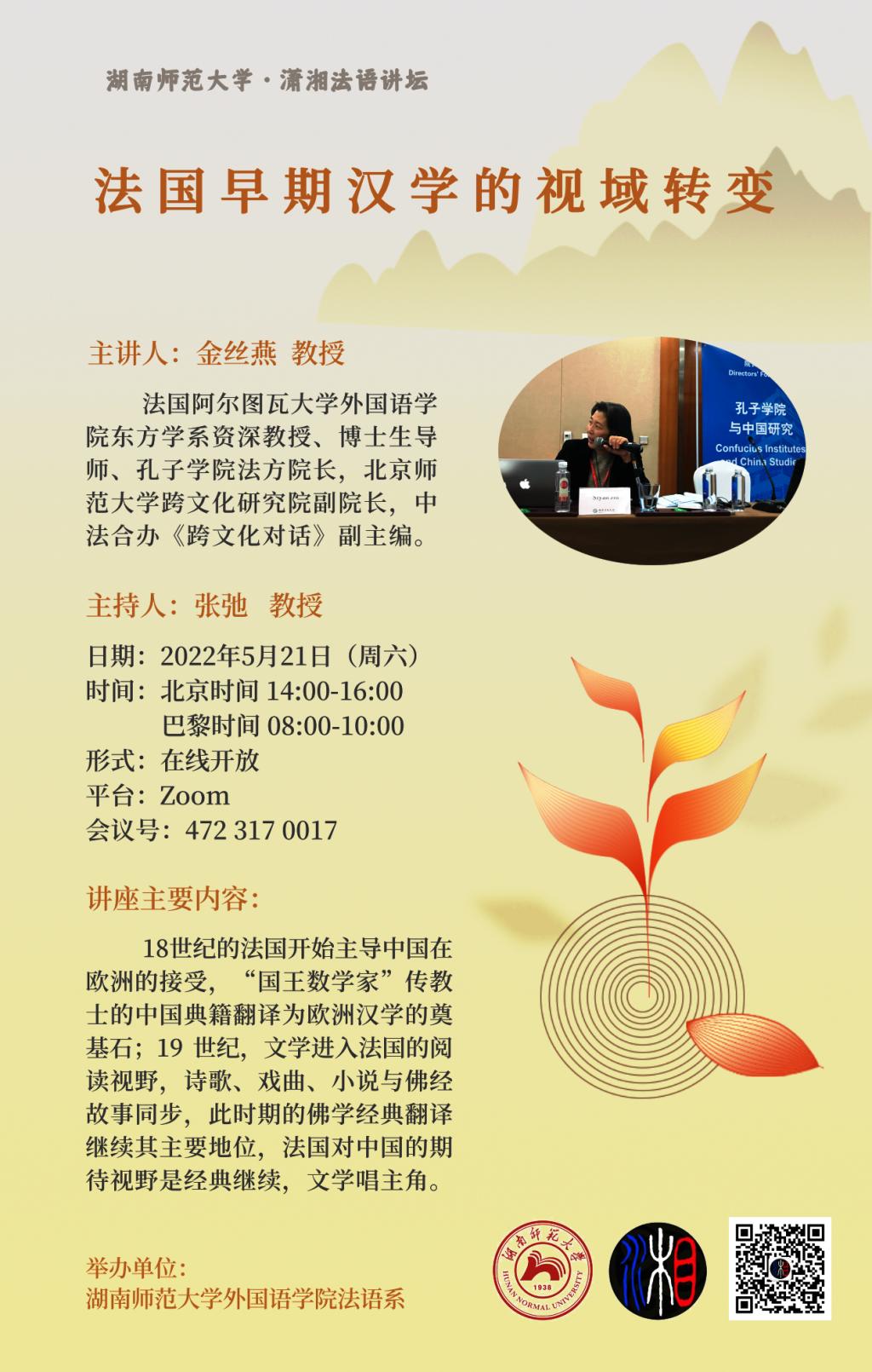 (通讯员 杨逸 彭瑞雪 李怡 金晓童)5月21日下午,在Zoom会议平台上,法国阿尔图瓦大学澳门pg官方电子平台东方学系金丝燕教授做了题为《法国早期汉学的视域转变》的线上学术讲座。