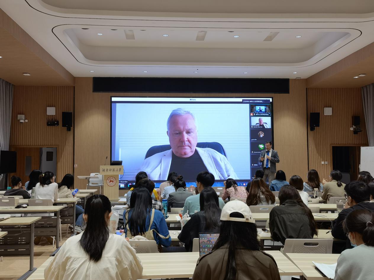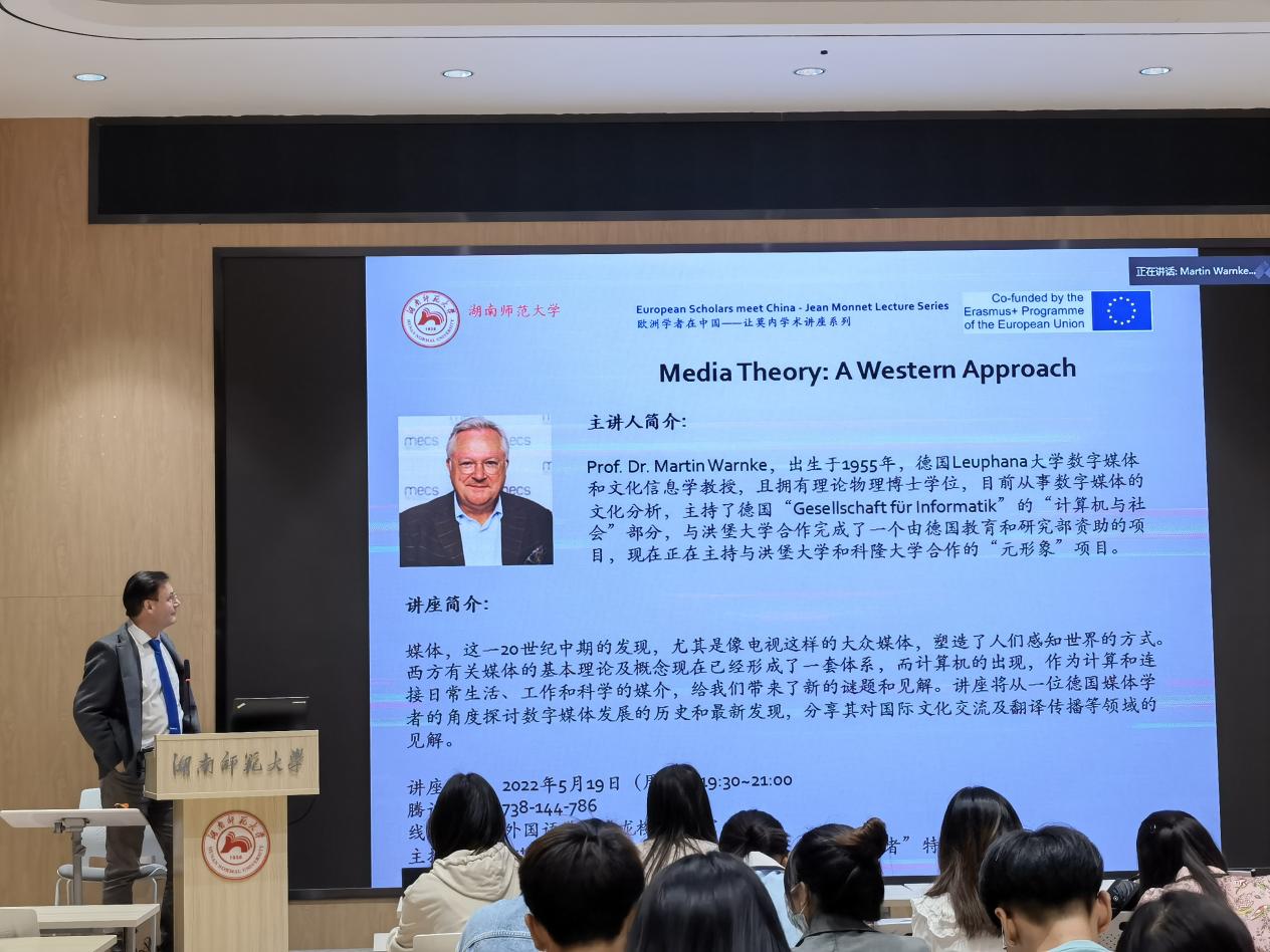 (通讯员 李欣 )5月19日晚,我校邀请到吕内堡大学文化与数字媒体美学研究所所长、“计算机模拟媒体文化高级研究所”主任、德国“媒体研究杂志”顾问Martin Warnke教授于我校腾龙楼613开展了“Media Theory: A Western Approach”主题讲座,会议由我校特聘教授Martin Woesler主持。因疫情影响,本次讲座采取了线上线下结合的形式,Martin Warnke教授于线上展示,我校澳门pg官方电子平台学子于613教室与Martin Warnke教授进行互动。