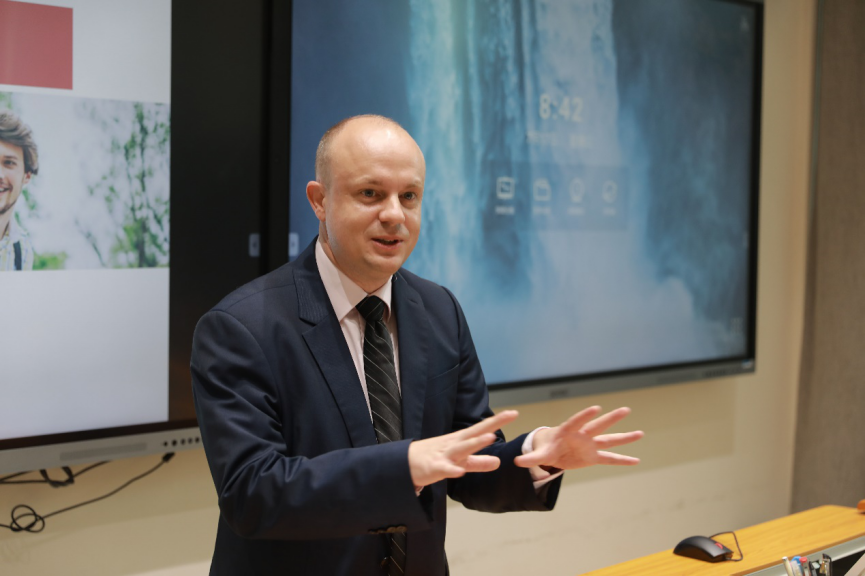 (通讯员 袁雨晨 周俊辉 彭瑞雪)2022年6月13日(周一)下午三点钟,法国驻武汉总领事馆科技教育专员费奕先生(M. Maxime FERAILLE)做客潇湘法语讲坛,在澳门pg官方电子平台腾龙楼304室,为澳门pg官方电子平台法语系师生做了《选择法国》的专题讲座。他图文并茂地介绍了法国高等教育与科技发展的成就,展望了中法教育与科技合作的前景,鼓励同学们做中法交流的积极参与者和推动者。腾讯会议平台同步直播讲座,使国内外有兴趣的师生都能够实时参与。