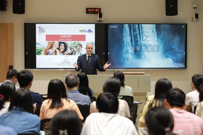最后,费奕先生从三个方面提出了关于申请中法教育与科技合作项目的相关建议。其一,他建议学生在留学前做好充足的准备,密切关注留学项目的动态,借助法国高等教育署官方网站查找适合自己的学科和授课项目;其二,为了帮助学生寻找合适的博士项目,费奕先生还推荐了一些资源和研究工具,有利于申请留学的学生与国内外的校友们取得联系,也有利于寻求校友、老师的帮助和建议;其三,他指出在长沙也可以参加一系列中法文化的交流活动,如法语活动月、中法文化之春、中法环境月等,他鼓励学生在活动中提升法语水平和体验法国文化。