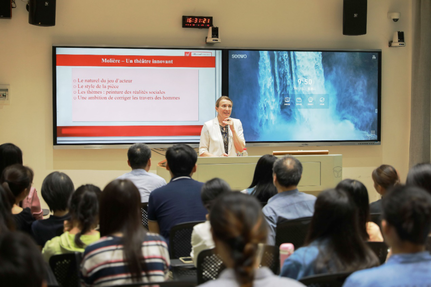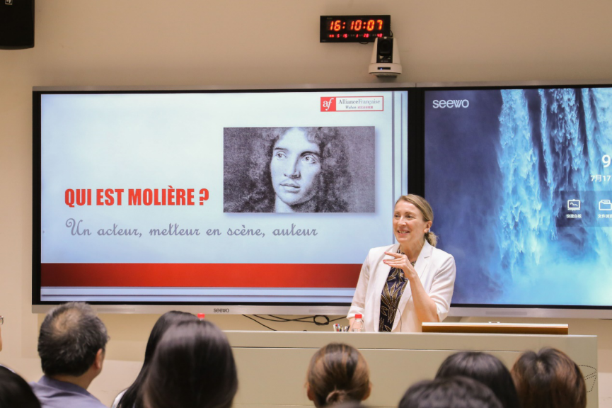 (通讯员 周俊辉 彭瑞雪)2022年6月13日(周一)下午四点钟,在澳门pg官方电子平台腾龙楼304室,武汉法语联盟法方校长乐华女士(Mme Valérie LEROY)做客潇湘法语讲坛,为澳门pg官方电子平台法语系师生做了题为《莫里哀的生平及作品分享会》的主题讲座。腾讯会议平台同步直播讲座,使国内外有兴趣的师生都能够实时参与。