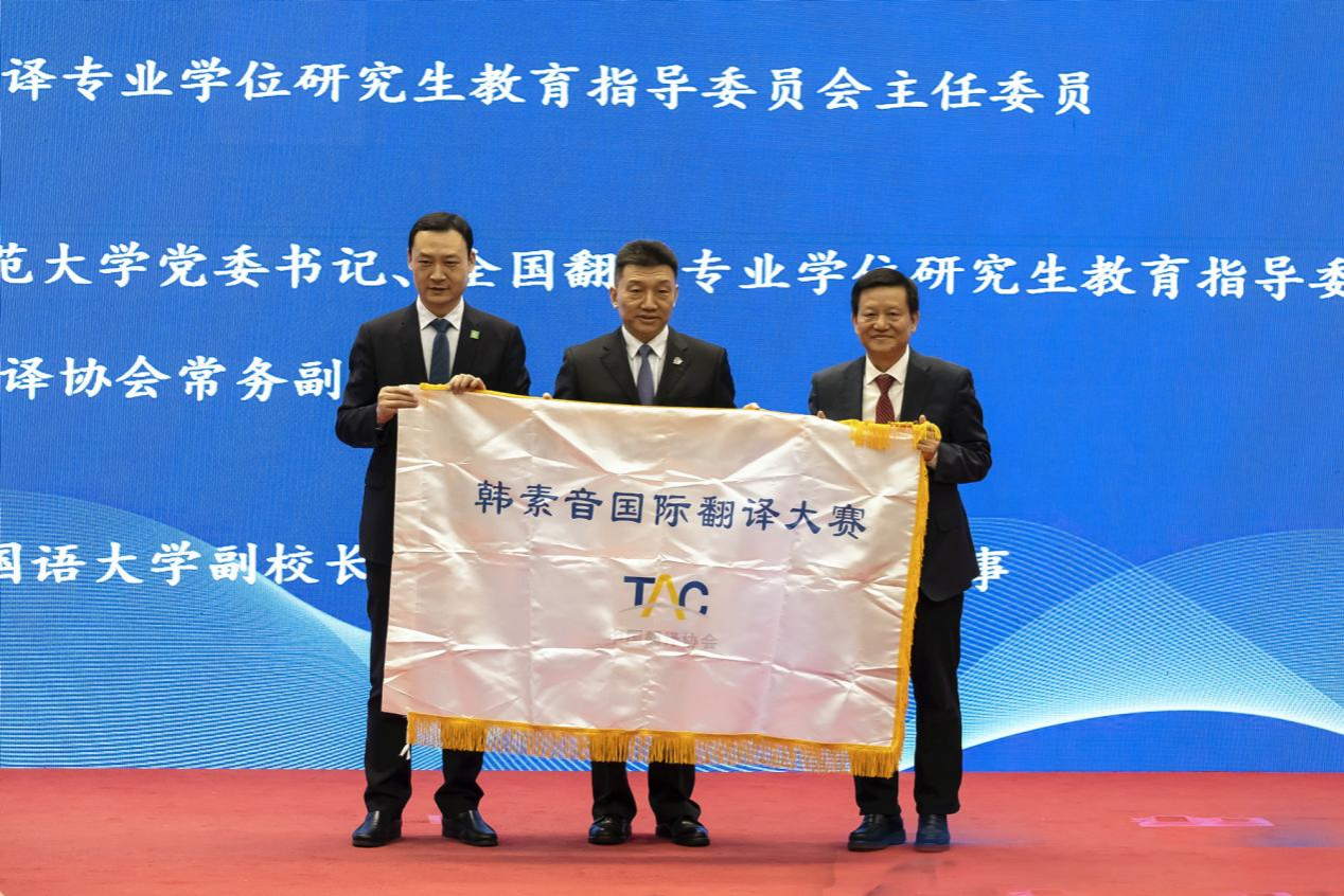 (通讯员 胡云天)11月25日,新时代对外话语创新高峰论坛暨第35届韩素音国际翻译大赛颁奖典礼在北京举行。中国外文局副局长、全国翻译专业学位研究生教育指导委员会主任委员于涛,中宣部国际传播局研究处处长季萌,我校党委书记、全国翻译专业学位研究生教育指导委员会副主任委员、中国翻译协会常务副会长蒋洪新,西安外国语大学副校长、中国翻译协会常务理事吴耀武出席活动,活动由当代中国与世界研究院副院长范大祺主持。