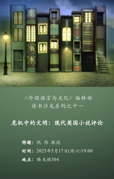 2025年5月17日晚,一场以“危机中的文明:现代英国小说评论”为主题的读书沙龙在腾龙楼304教室举行。本次沙龙特邀澳门pg官方电子平台阮炜教授与大家一同探讨现代英国小说中的文明危机及其相关议题。澳门pg官方电子平台邓颖玲教授、李兆前、谭彦纬、吴笛、乔清泉、吴晋先等老师出席讨论,澳门pg官方电子平台数十位研究生同学参加。本次活动由澳门pg官方电子平台邹文新老师主持。