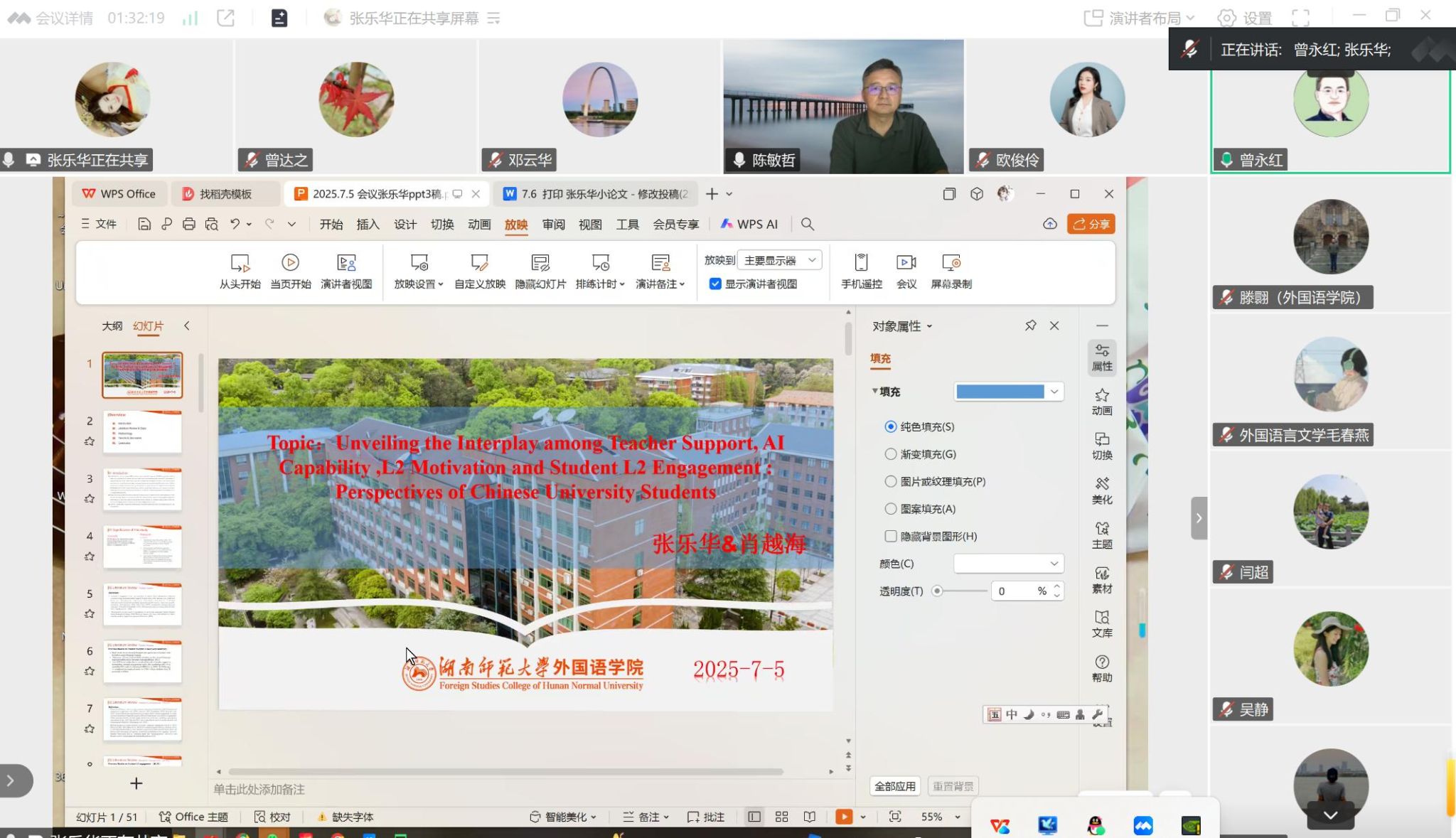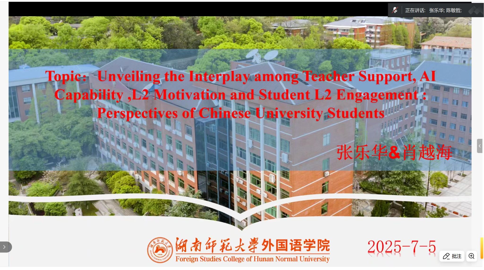 随后,张乐华同学发表了题为《Unveiling the Interplay among Teacher Support, Student Engagement, AI Capability and L2 Motivation: Perspectives of Chinese University Students》的报告。她以中国大学生为研究对象,深入剖析了教师支持、学生参与度、人工智能能力与二语学习动机之间的相互作用关系,为二语教学领域提供了新的研究视角。该报告的指导老师肖越海教授也出席了论坛。