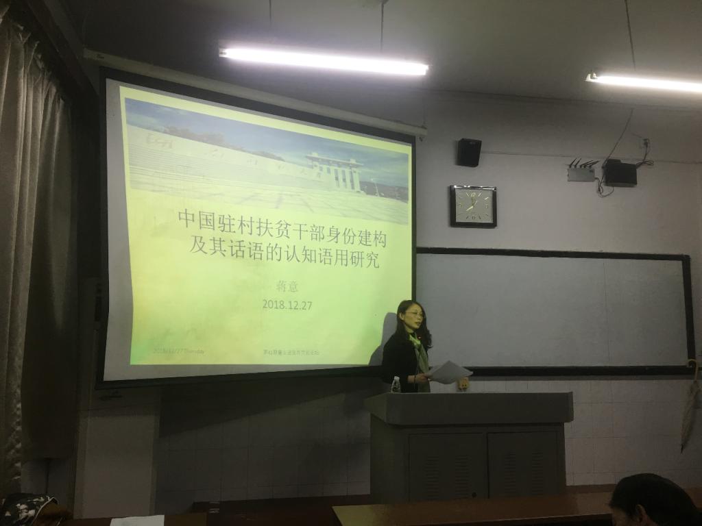 蒋意博士生的主讲题目为“中国驻村扶贫干部身份构建及其话语的认知语用研究”。研究通过对中国驻村扶贫干部实际话语中称谓语的使用、隐喻的使用,情态助动词的使用三个方面的分析,发现驻村扶贫干部与贫困户双方的总目的关系一致,但存在子目的冲突的现象;在扶贫会话交际中,合作与干预是帮扶关系中的一对统一体。合作是目的,干预是手段。主讲人从研究缘起到研究内容总体介绍了扶贫干部语用身份构建的可变性、功能性和商讨性。