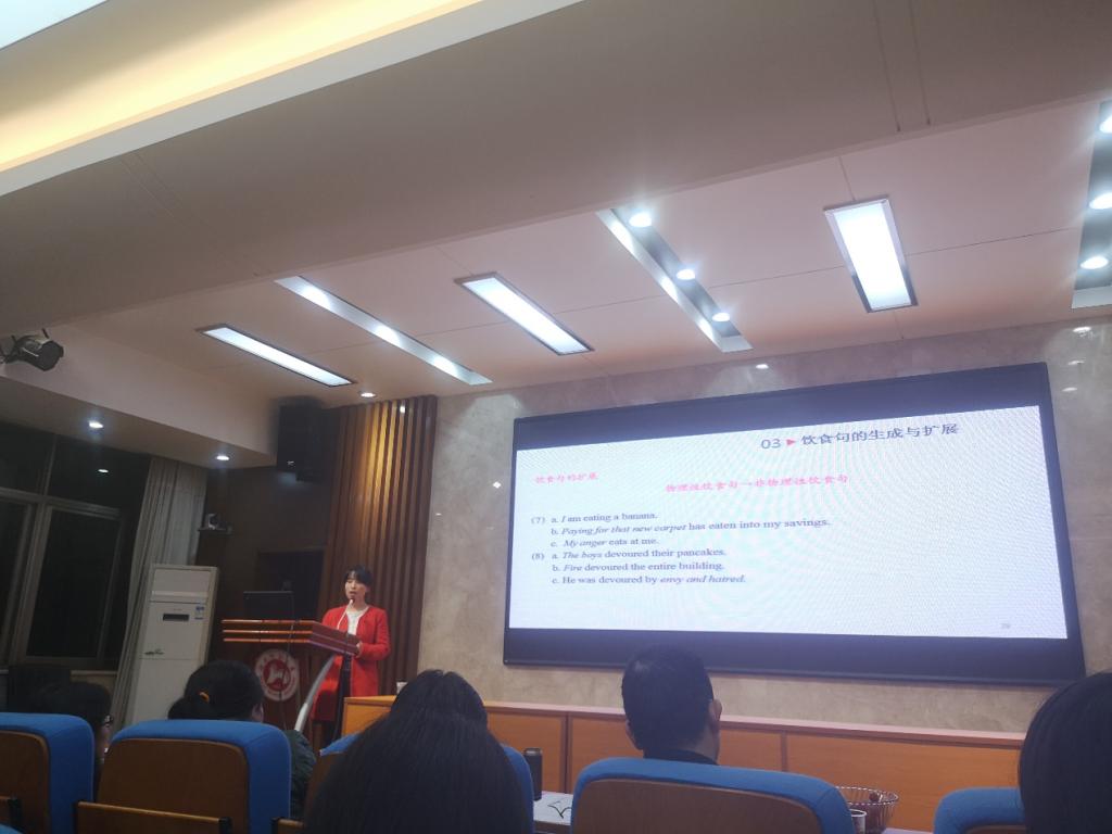 赵丹博士生的主讲题目为“饮食概念和英语饮食句的生成与扩展”。报告从概念化的视角探讨了英语饮食概念和饮食句的生成与扩展,指出饮食概念是人类对饮食行为进行概念化的结果,饮食概念通过人类和食物之间的种种互动隐喻性地投射到社会域和心理域。在此基础上,该研究进一步提出了英语饮食句生成与扩展的模式。