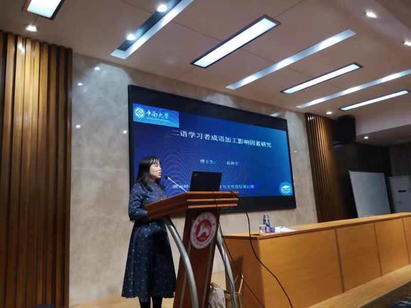 屈典宁博士生的主讲题目为“二语学习者成语加工影响因素研究”。通过系列实验,该研究探讨了组构性、母语与二语成语一致性对中国英语学习者成语加工的影响。研究结果表明:对于中低水平英语学习者而言,组构性、母语与二语成语一致性主效应显著。主讲人从构式的原型效应、成语的句法凝固性以及大脑的加工方式等角度对实验结果进行了讨论。