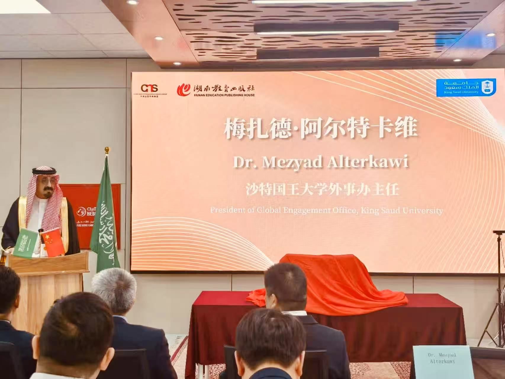 2025年6月19日,由澳门pg官网曾艳钰教授为总主编的《新汉语教程》系列新书发布及“湖南书架”赠书仪式在沙特阿拉伯利雅得智慧宫中文教育学院隆重举行。此次活动由湖南教育出版社与沙特苏武德国王大学联合主办,沙特苏武德国王大学外事办主任梅扎德阿尔卡维、语言学院院长穆罕默德哈班博士,苏尔坦亲王大学孔子学院沙方院长易卜拉欣格拉姆斯,以及沙特利亚德政治和战略研究中心副主任阿卜杜勒沙巴等人士出席发布会。