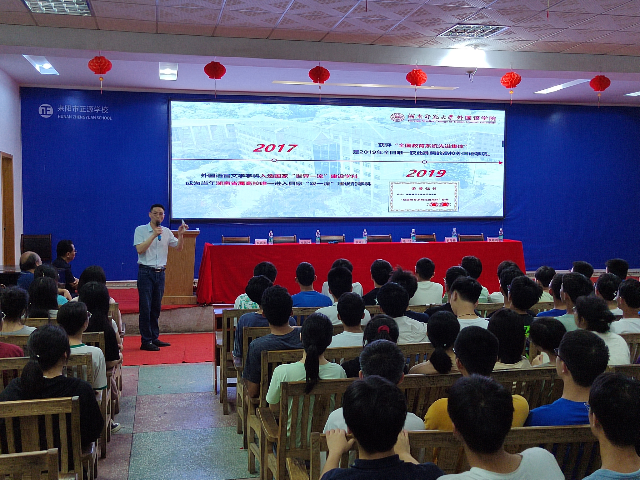 5月17日,我校优质生源基地授牌暨“名师进中学”系列活动在耒阳市正源学校举行。澳门pg官网副院长梁斌、我校潇湘学者特聘教授肖华锋、英语系教师李洪坤、日语系教师吴雅莉,耒阳市正源学校校长罗湘云、副校长周济龙和该校高二、高三全体师生共计300余人参加本次活动。活动由正源学校校长罗湘云主持。