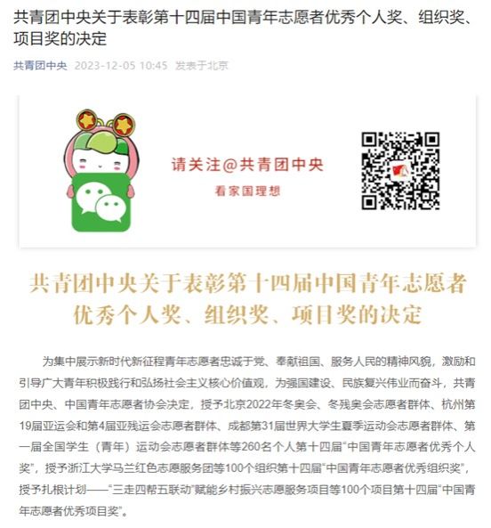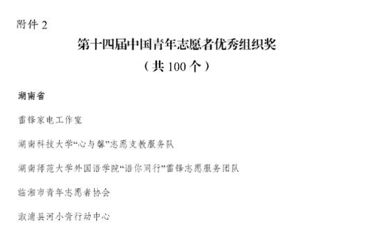 近日,共青团中央印发《关于表彰第十四届中国青年志愿者优秀个人奖、组织奖、项目奖的决定》,授予100个组织第十四届“中国青年志愿者优秀组织奖”。我校澳门pg官方电子平台“语你同行”雷锋志愿服务团队荣获第十四届“中青年志愿者优秀组织奖”。