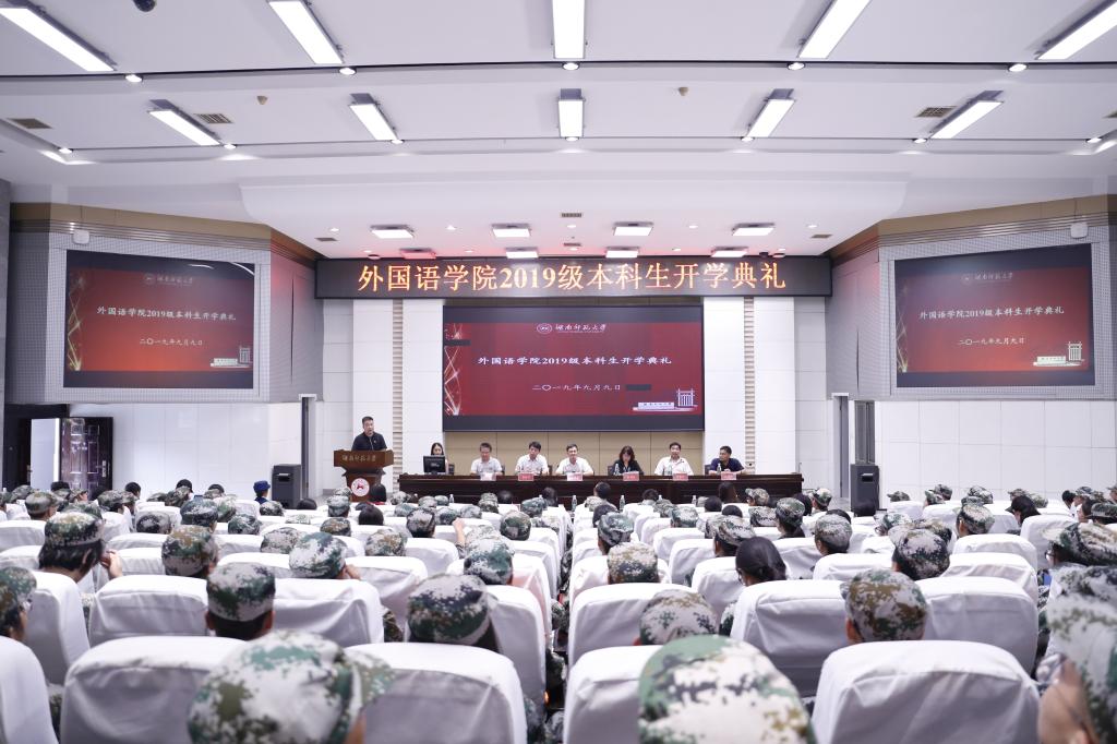 9月9日下午,澳门pg官网在至善讲堂隆重举行2019级本科新生开学典礼。学院院长曾艳钰教授,党委书记唐建文,常务副院长谭福民教授,副院长、俄语系系主任高荣国教授,英语系系主任陈敏哲教授,翻译系余承法教授,日语系系主任向卿博士,朝鲜语系系代主任闫超博士,教师代表、全国优秀硕士指导老师曾永红教授出席典礼。典礼由学院党委副书记贺慧星主持。