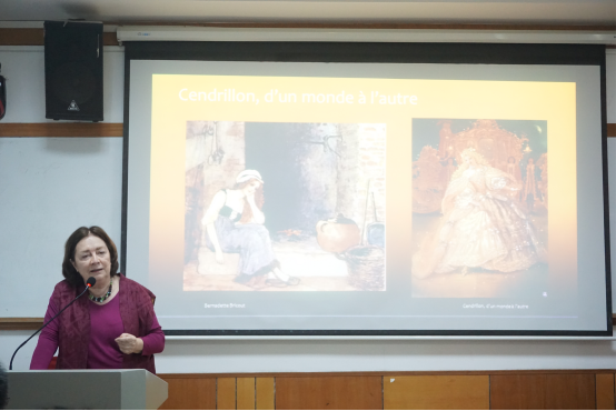 此次讲座中,布里谷教授以童话故事《灰姑娘》为切入点,从故事起源、各国版本、价值观、人性等多个方面来分析了《灰姑娘》的文化内涵以及在不同社会背景下的文化差异。通过对多个版本的辩证思考分析,布里谷教授向同学们展示了不同文化背景下,人们对童话故事赋予的不同含义,并引导同学们进行深入思考。此外,布里谷教授还强调了童话故事对孩子们的重要性,她呼吁父母们尽可能多地亲口讲述故事,陪伴孩子成长。同时,布里谷教授表示,给孩子们讲童话故事时还应当有所选择,不可玉石不分。提问环节中,同学们踊跃地表达了自己的观点及疑惑,布里谷教授一一解答,现场气氛热烈。