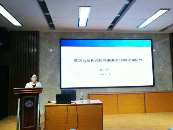 黄广平博士生的主讲题目为“英汉动结构式历时演变对比的认知研究”。该研究基于语法化理论,构式语法理论以及力动态理论等,分别探讨了英汉动结构式的历时演变特征,以及英汉动结构式历时演变特征的共性和差异,并且进一步探究其历时演变的机制动因和认知理据。