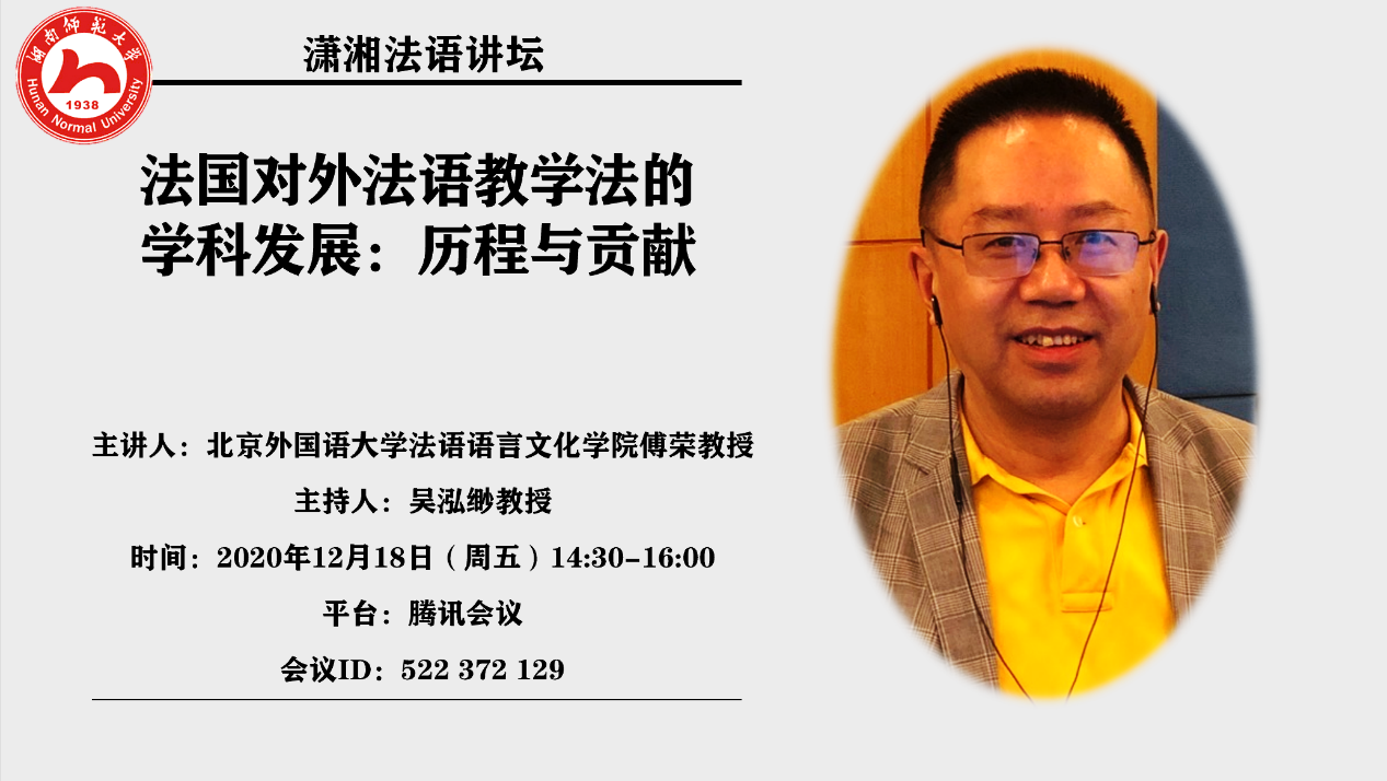 (供稿法语系)2020年12月18日下午,北京外国语大学法语语言文化学院教授、博士生导师傅荣做客澳门pg官网“潇湘法语讲坛”,为澳门pg官网法语系师生做题为“法国对外法语教学法的学科发展:历程与贡献”的线上专题讲座。讲座由法语系特聘教授、博士生导师吴泓缈主持。