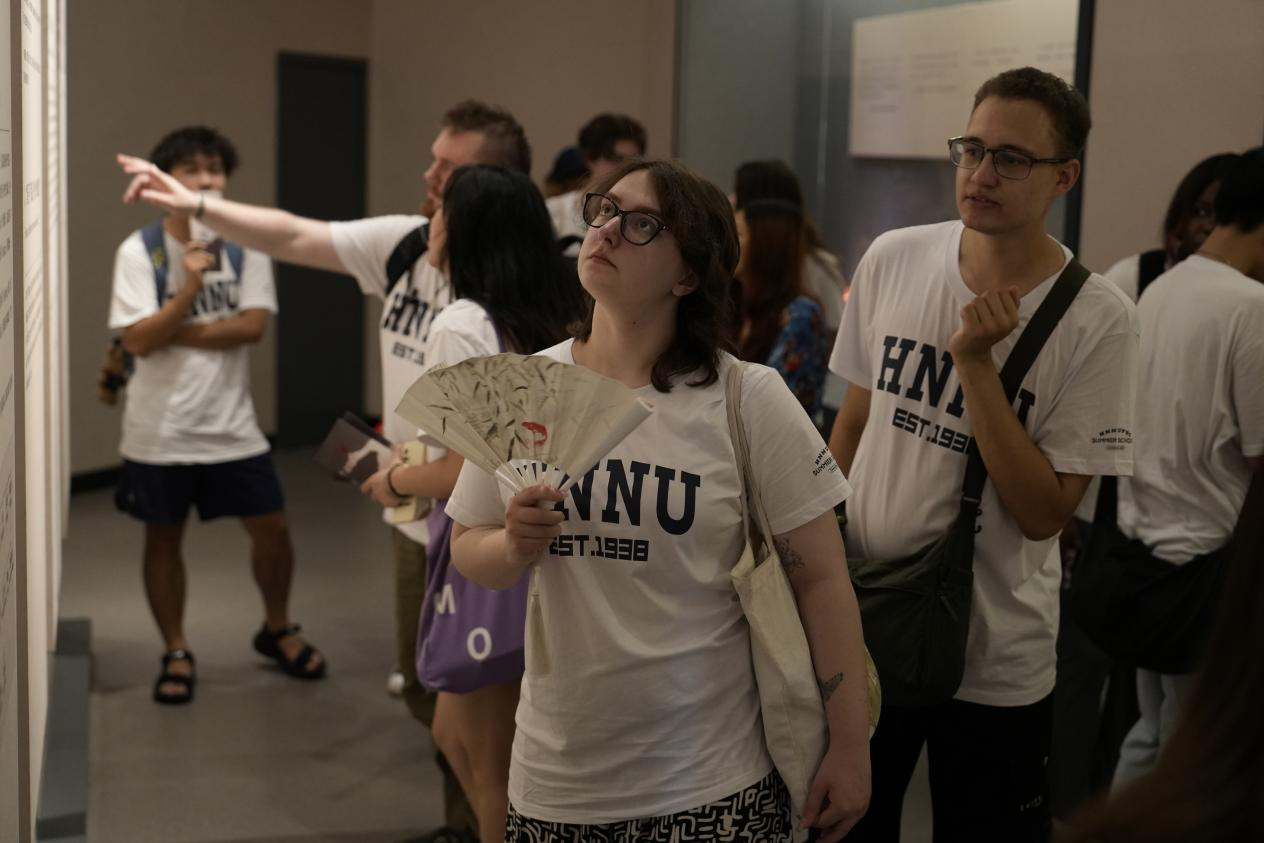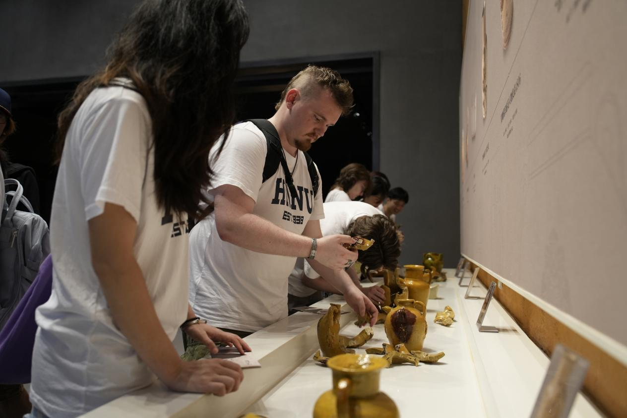 在长沙铜官窑博物馆内,澳门pg官方电子平台志愿者程林甲化身文化使者,用流畅的中英文传颂着1200多年前“黑石号”商船上承载的长沙陶瓷记忆,细数着唐代长沙铜官窑陶瓷业的辉煌历程与发展变迁。学子们透过一件件承载着岁月痕迹的陶瓷展品,眼前浮现出铜官当年窑火通明、商贾云集的繁荣景象。中英学子们驻足凝视,时而惊叹于唐代工匠精湛的技艺与惊人的智慧,时而交流探讨近代双方陶瓷文化的异同,在历史与艺术的交融中深切地感受了中国传统文化的深厚底蕴。学子们还在博物馆互动区亲身体验了文物修复的快乐与艰辛,深刻理解了优秀文化保存与传扬的重要意义。